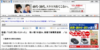 同署によると、男性が車中にいた男を発見。現行犯逮捕し、「車の中にいた男を捕まえた」と110番した。男は灰皿にある吸い殻を取り出し、車内を物色中で、所持金はなかったという。