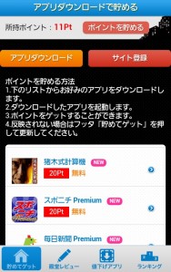 「アプリじゃーなるPlus」で有料アプリをタダで手に入れる方法は簡単。このアプリで貯めたポイントと引換にダウンロードする仕組みだ。ポイントは「ポイントを貯める」ボタンでリストアップされるアプリ、もしくはサイトから好きなものを選んでインストールや無料会員登録することで配布される。