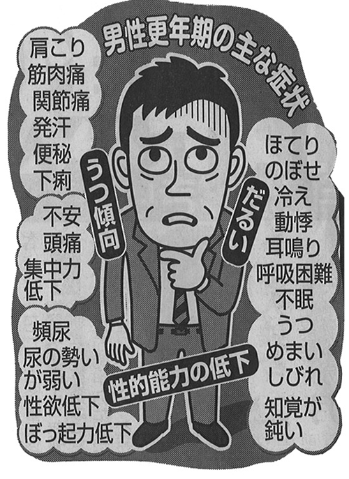 「男性更年期障害」(LOH症候群)の症状は大きくわけて精神面と肉体面の2種類が挙げられるそうです。精神面では不安、イライラ、抑うつ、不眠、集中力・記憶力の低下など。肉体面では筋力の低下、慢性的な疲労感、ほてり、発汗、頭痛、めまい。そして男性の性の根源をつかさどる性欲の減退、ED(勃起不全)などの症状が起こっちゃうみたいです。