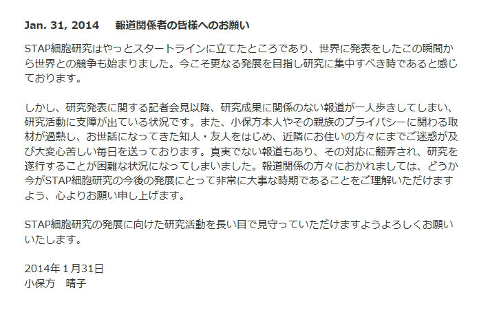 小保方さん本人もこういったマスコミの対応に苦言