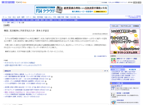【ソウル共同】韓国の旅客船セウォル号沈没事故で、水没した船内の空気だまりに生存者がいると想定し韓国政府の救助チームが行った船内への空気注入作業で、人体に致命的な一酸化炭素など不純物で汚染された工業用圧縮空気を送り込んでいた疑いがあることが30日までに分かった。