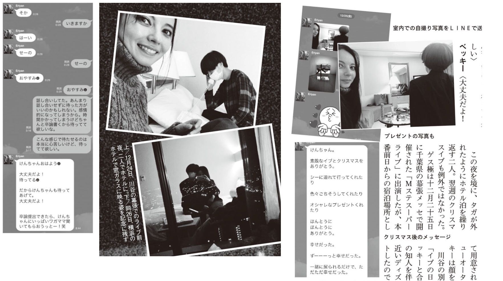 またホテルでは寄り添うように座る2人の写真まで撮られているほか、ホテル内での2人の写真が週刊誌に掲載されている。おそらく川谷絵音さんのLINEを見た関係者(奥さんや知人)がリークしたものだと思われる。LINEのやりとりも川谷絵音さんの発言が右に来ているので、川谷絵音さん側の端末でスクリーンショットを撮ったとことは確実だろう。