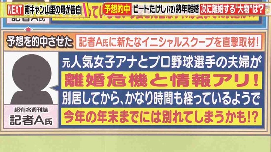 記者は「元人気女子アナとプロ野球選手の夫婦に離婚危機。別居してからかなりの時間がたっていて今年の年末に離婚する可能性が高い」と明かした。